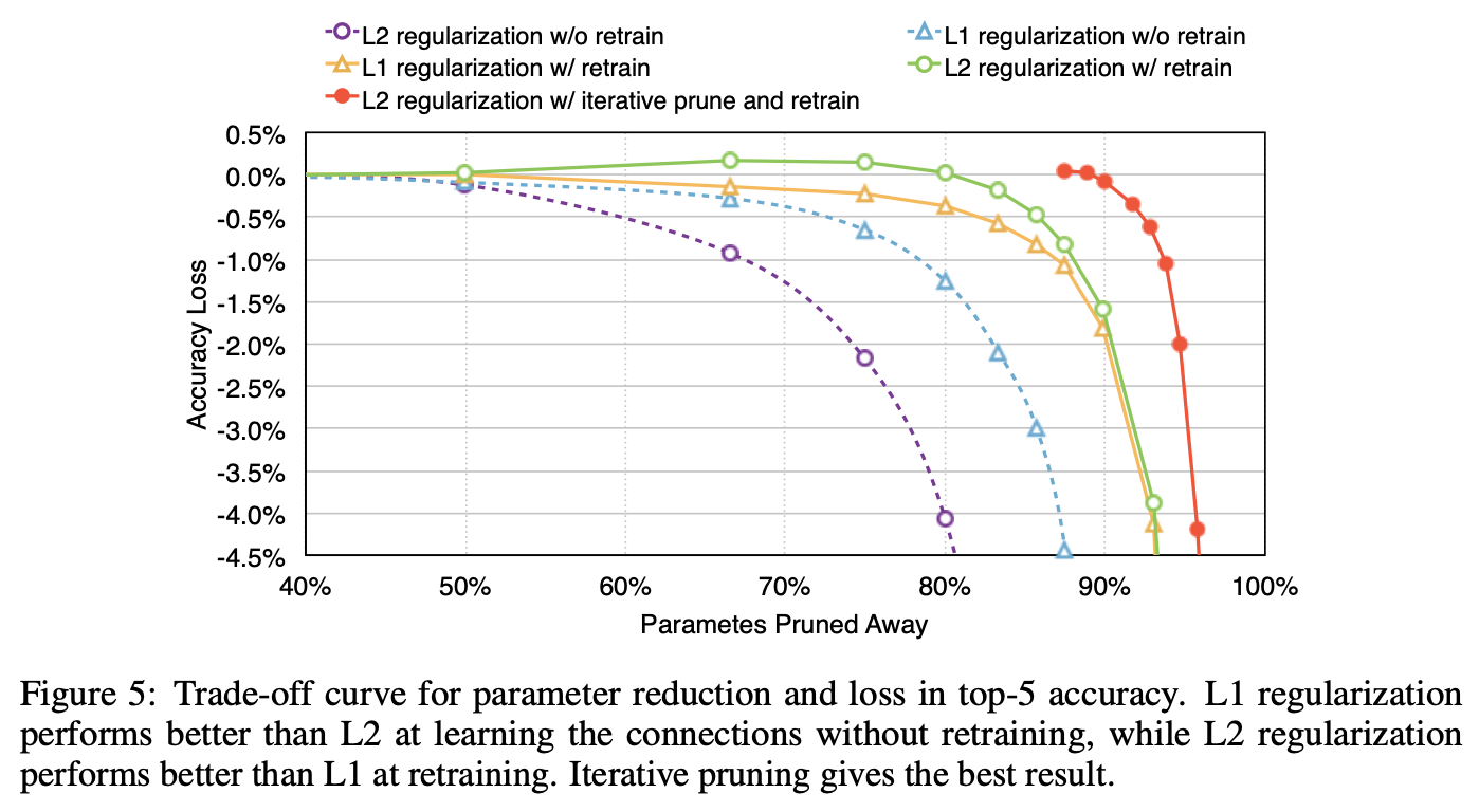 iterative 한 방법이 한 번에 pruning 하는 것보다 정확도 손실 없이 AlexNet에 대해서 5~9배의 압축을 할 수 있다.
