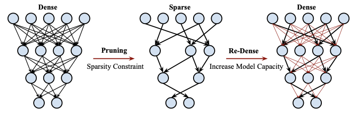 3. D step - Increase the model capacity, re-initialize the pruned params and retrain the whole dense network
