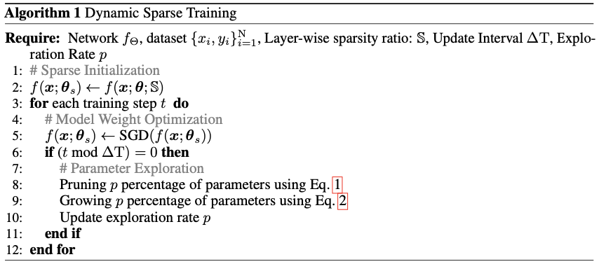 1 - (count(sparse_weight != 0) / count(dense_weight != 0)) 라고 보면 된다. - DST의 목표는 target sparsity S를 갖는 sparse network를 학습이 끝난 후에 만드는 것으로, computational, memory overhead는 거의 static sparse model을 학습시키는 것과 비슷해야한다.