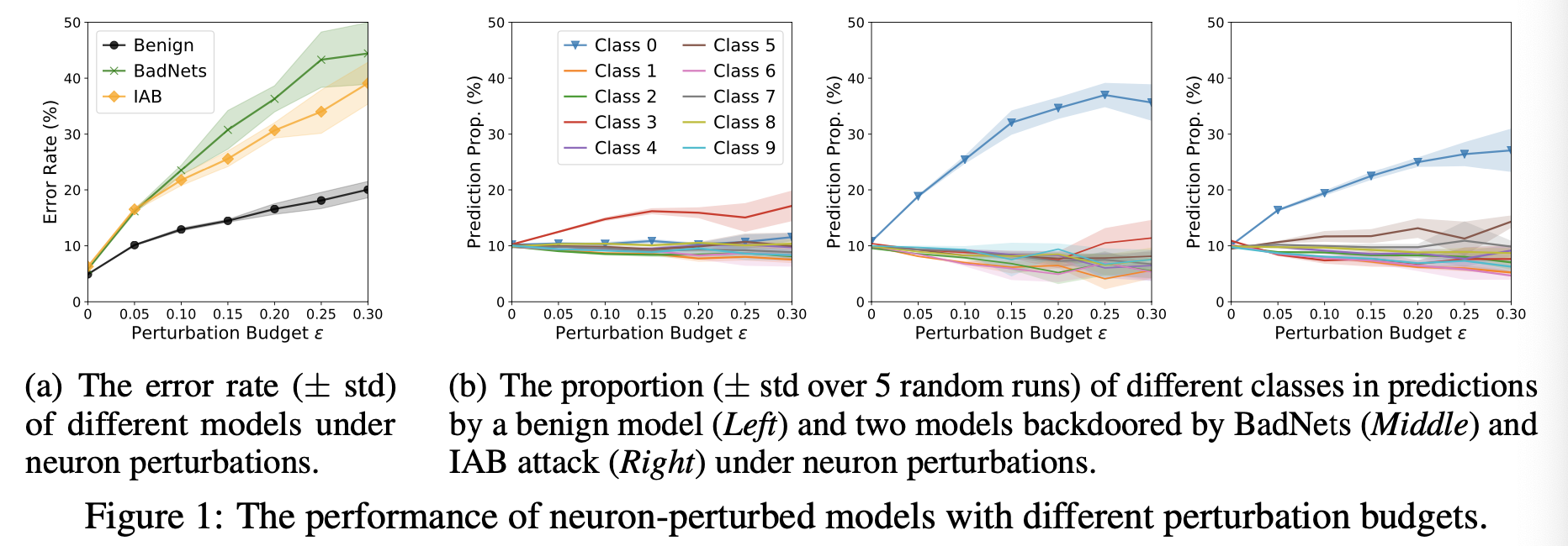 그림1의 a)를 보면, adversarial neuron perturbations의 budget $\varepsilon$ 가 커질수록 misclassification이 증가하는 것을 볼 수 있다. 또한 정상인 benign모델과 비교했을때, 어느 $\varepsilon$에서도 backdoored models (BadNets, IAB)의 error rate가 크다.