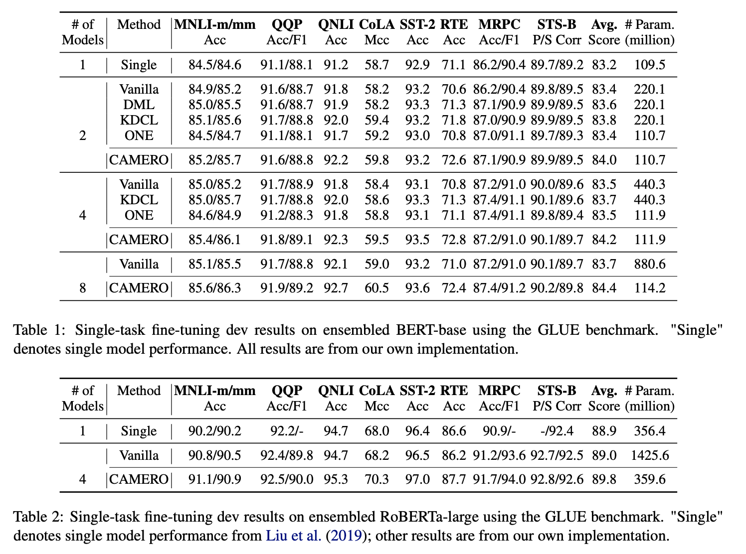 GLUE bench-mark에서 8-BERT ensemble보다 더 적은 메모리로, 0.7배 더 좋은 성능을 보였다. (114.2M vs 880.6M)