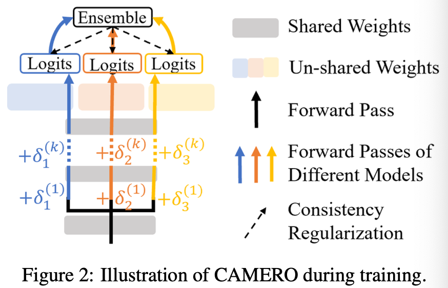 CAMERO란, bottom layer를 공유하지만, representation에 다른 perturbations를 적용하여 model의 diversity를 주는 방법이다.