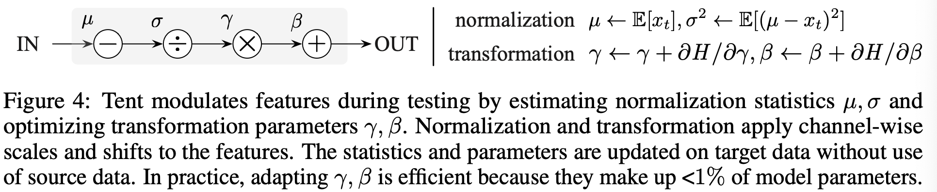 online, offline update를 이용해서 결과를 보였다. - Entropy를 adaptation의 목적으로 실험해서, test-time entropy minimization (tent)를 제안했다.