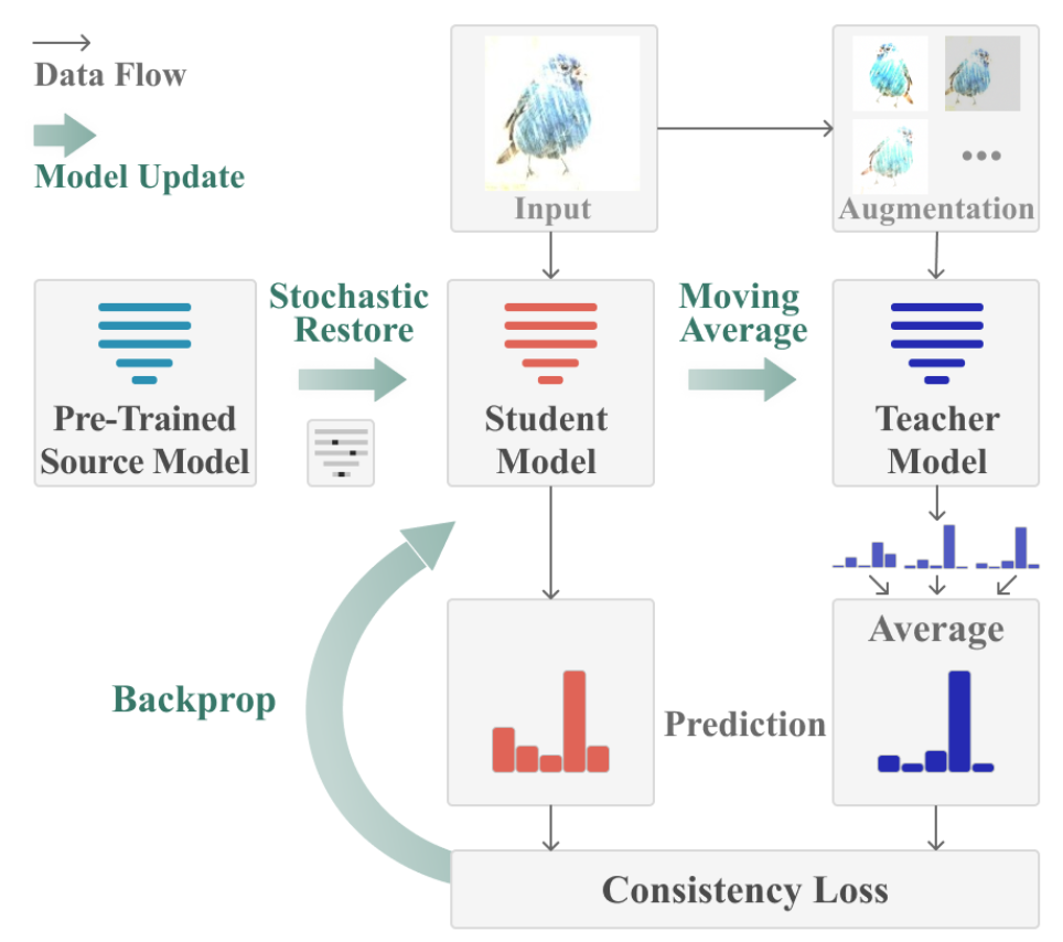 - 확률적으로 neurons의 작은 부분을 기존 source model로 돌려서 source domain knowledge를 잊지 않도록 했다.