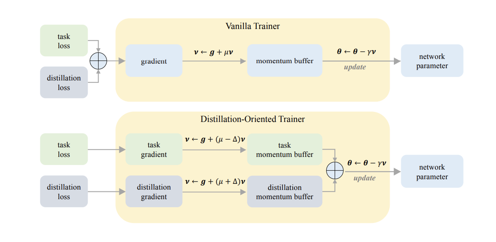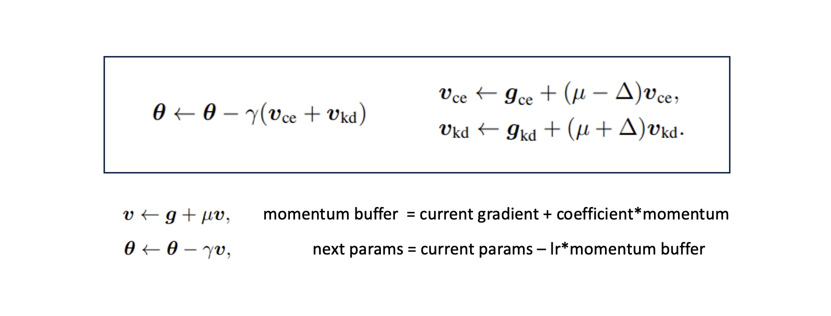 task loss와 distillation loss를 같이 최적화하되, distillation을 조금 더 확실하게 최적화 하기 위해, 논문에서는 모멘텀을 수정했다.