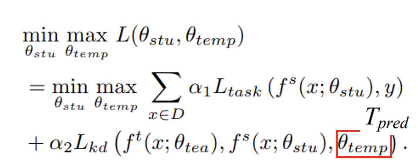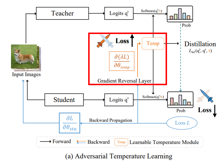 간단하게 말해서, distillation loss를 일반 모델은 gradient descent를 사용하여 update하고, temperature parameter는 gradient ascent를 사용해서 update한다.