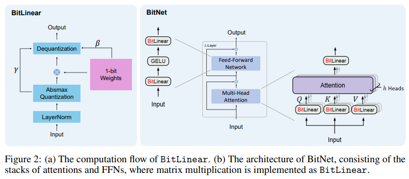 위 그림에서 볼 수 있듯, BitNet은 Transformer와 동일한 구조를 사용하고, 다른 것은 nn.Linear대신 1bit weight인 BitLinear를 사용한다는 것입니다.