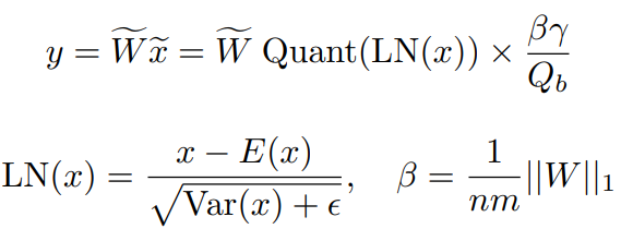 논문의 저자들은 quantization 이후의 분산값을 1로 보존하기 위해 activation quantization전에 LayerNorm을 사용합니다.