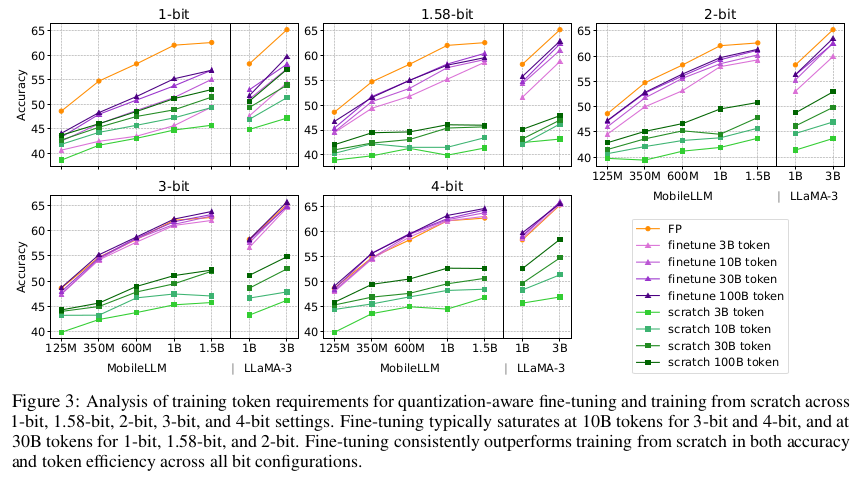 - Lower bit quantization은 약 30B tokens, Higher bit quantization은 10B tokens에서 수렴합니다.